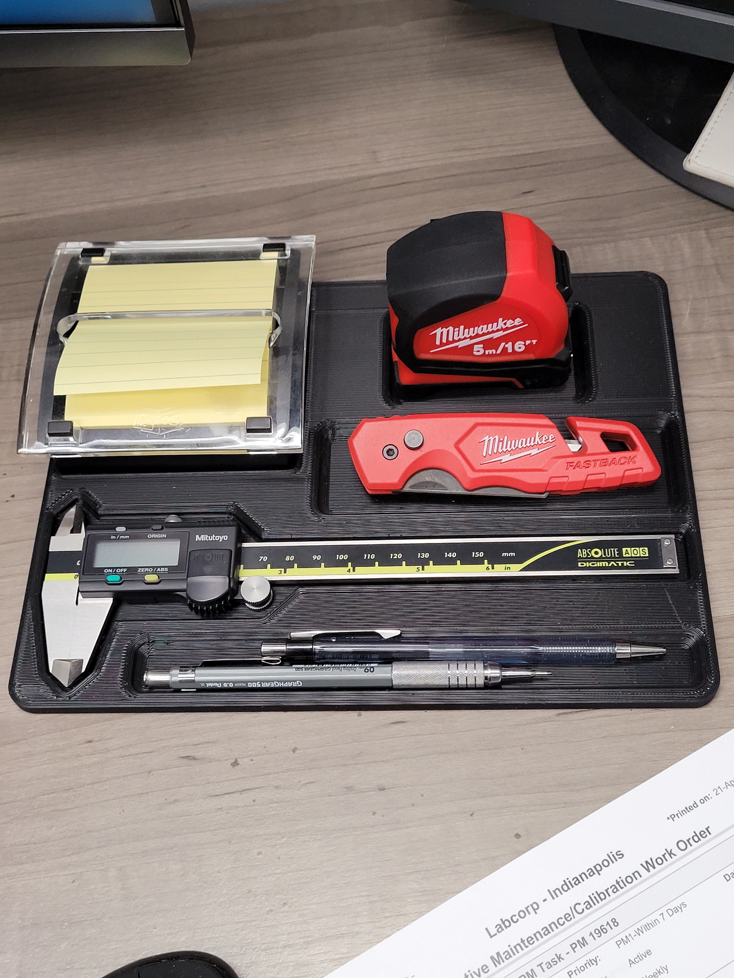 Työpöydän organisointilaite, jossa on Mitutoyo Calibre ja Milwaukee mittanauha ja veitsi.