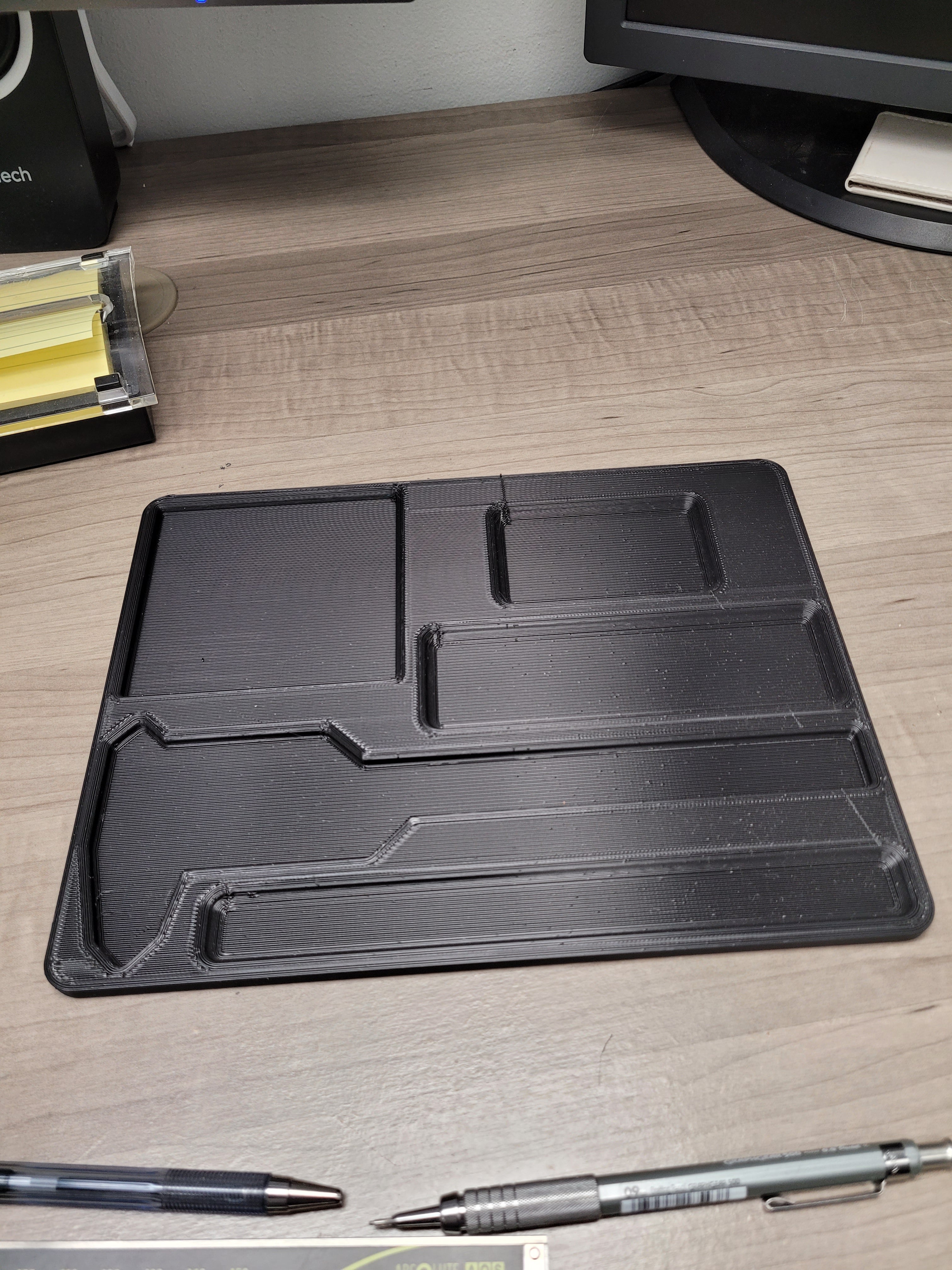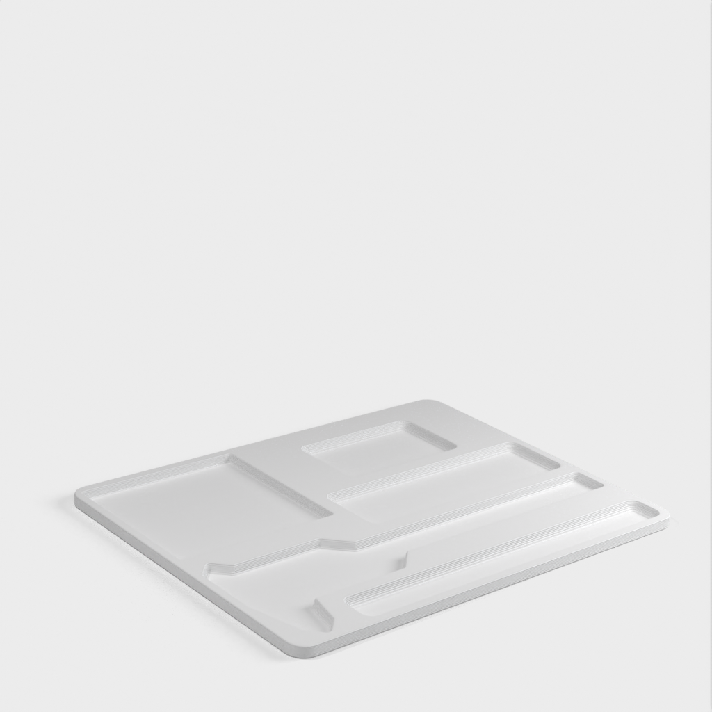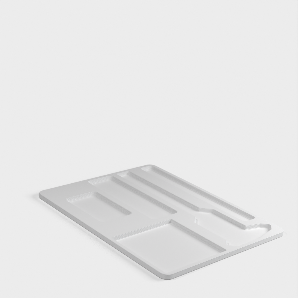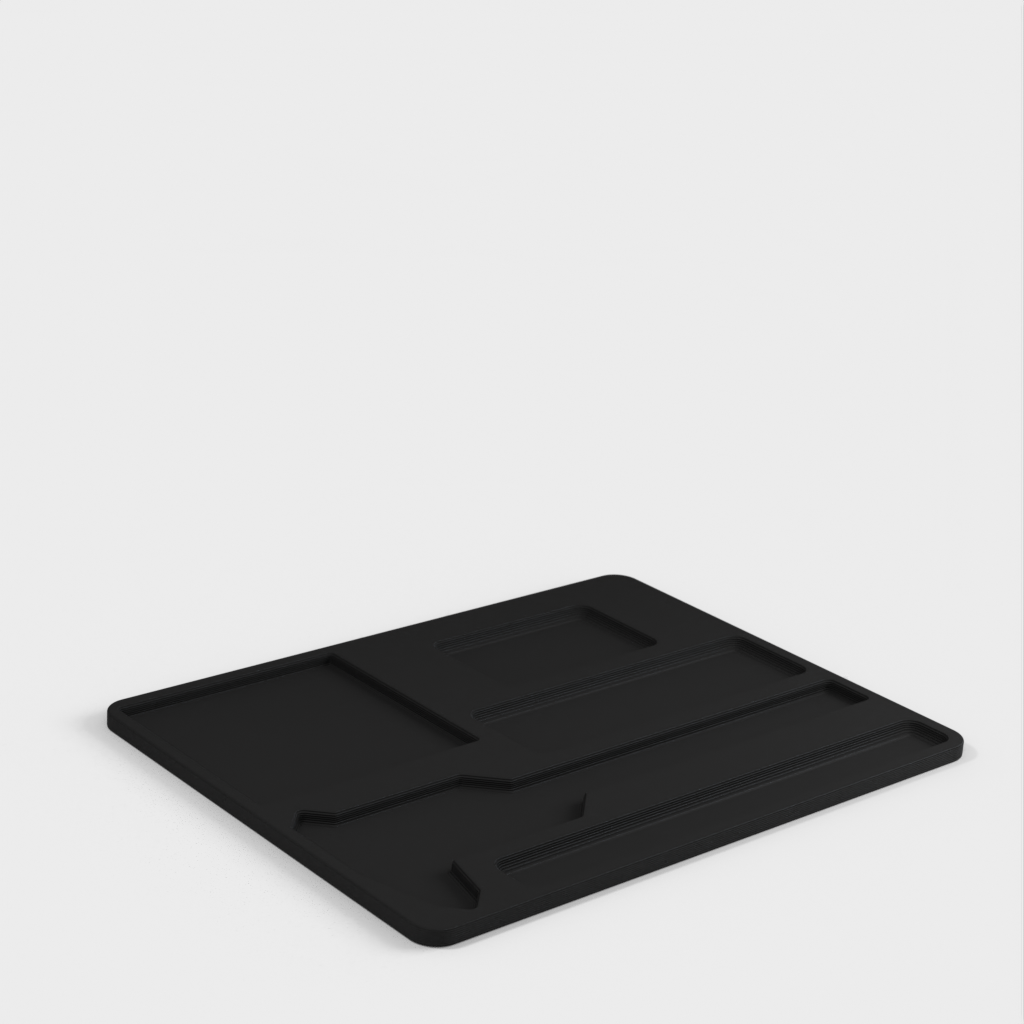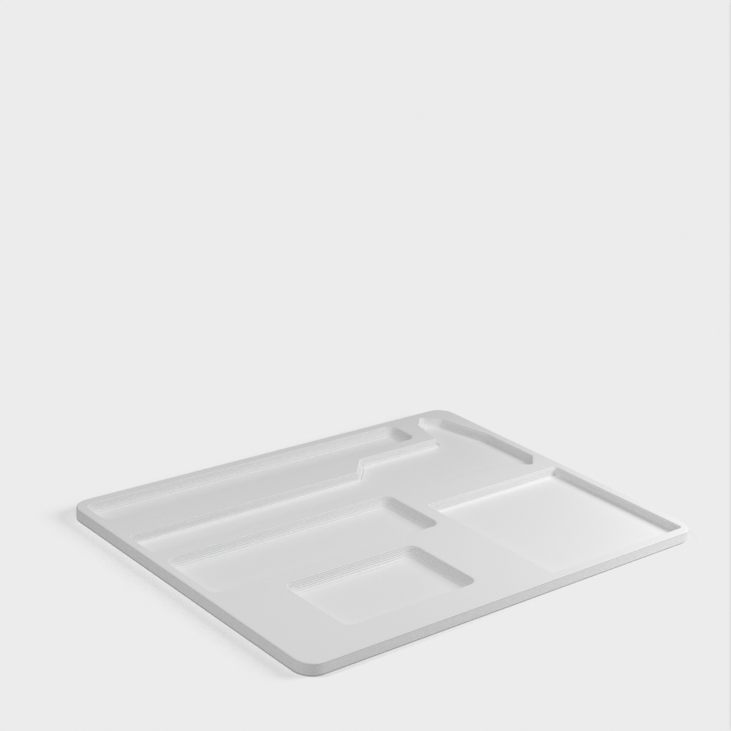 Työpöydän lajittelija, joka sisältää erilaisia työkaluja ja elementtejä, joita tarvitaan järjestettyyn ja toimivaan työtilaan. Se sisältää CD-6' ASX Mitutoyo -ruuvimittarin, Milwaukee 48-22-6617 -mittanauhan, Milwaukee 48-22-1501 -käsityöveitsen ja Post-it Pop Up -pidikkeen muistiinpanoja varten. Myös kynille, lyijykynille ja muille vastaaville tarvikkeille on varattu paikka.
