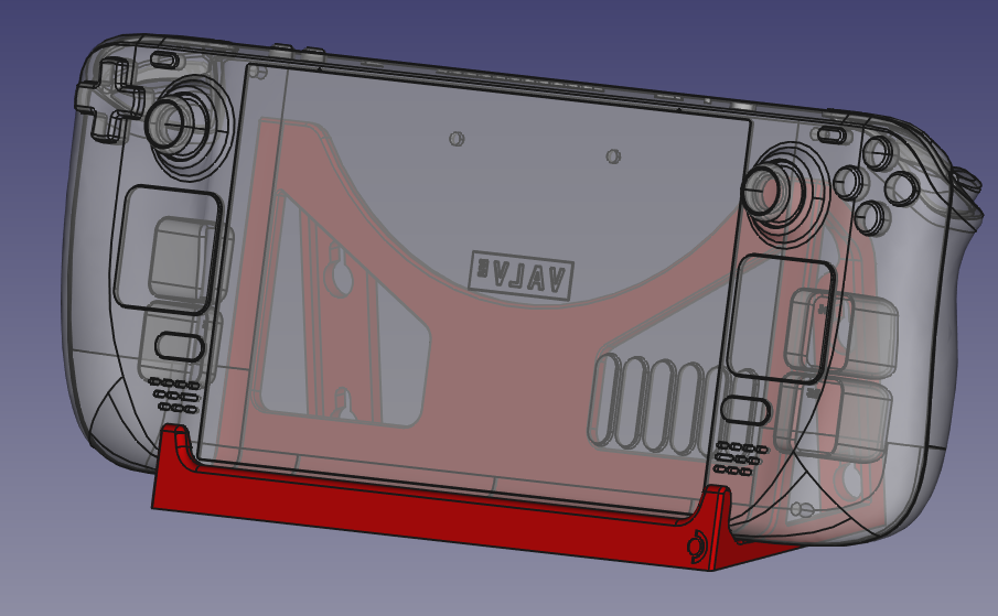 Tämä on yksinkertainen tuki Valve Steam Deck -mobiilitietokoneelle/-konsolille. Se voi toimia myös seinätelineenä. Löydät Steam Deck -mallin Valve Software Gitlab -arkistosta.